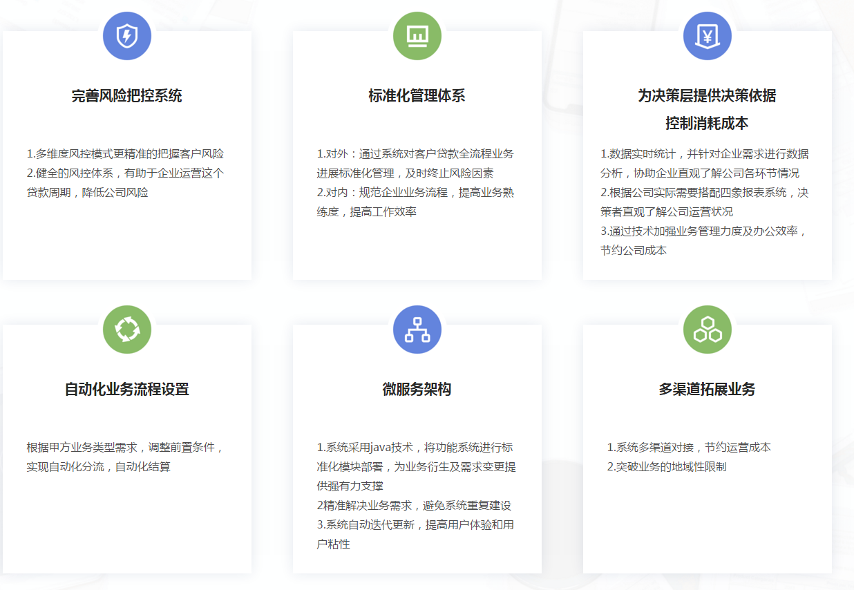 SYSTEM INTRODUCTION北京邦梦圆科技有限公司小额贷款业务管理系统信息化解决方案是面向国有小贷公司、民间小贷公司、村镇银行、农村信用社等机构量身打造的小额贷款业务管理系统。北京邦梦圆科技有限公司通过自主研发的小额贷款业务管理系统能够满足多样化业务场景,支持抵押类、质押类、供应链类、信用类等的多种业务模式,通过系统化管理,机构可全面掌握借贷过程中的内外因素,对内实现企业自动化流程审批,提高业务效率,减少客户因流程繁琐而造成的流失,对外科学把控贷款风险,帮助企业减少贷款坏账率。通过对内对外双重科学管理,为企业科学稳定发展助力。