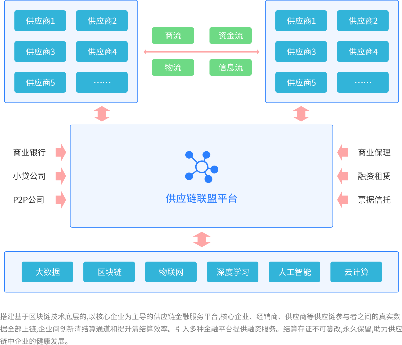 通过分布式的账本技术,供应链上下游企业能够共享核心企业的信用,使得基于核心企业应付账款下的付款承诺可以流转到多级供应商,解决企业间三角债问题,同时链条上的任意供应商融资都可以享受到核心企业的优质信用,降低整个链条的融资成本。